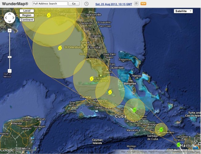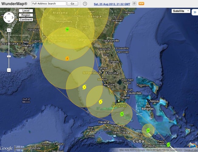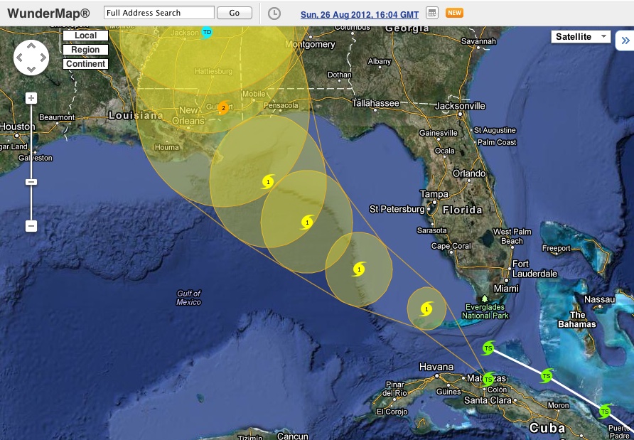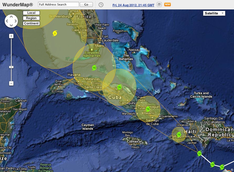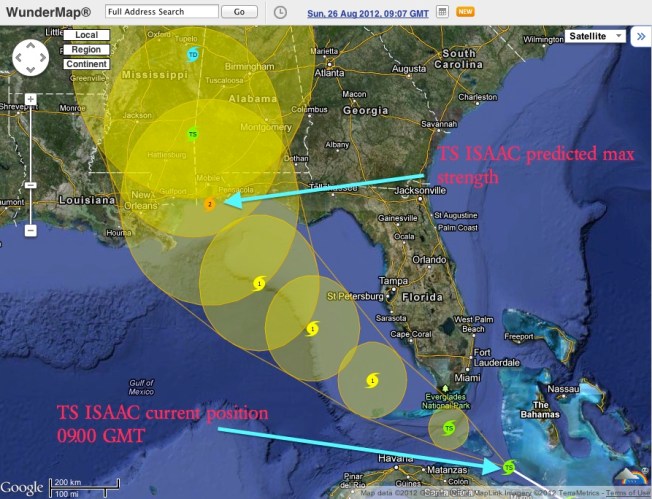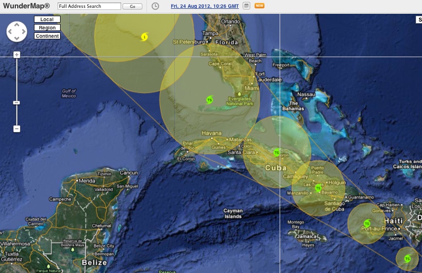 Clear signs that Isaac’s projected path has drifted slightly further westwards during the day – compare with the Wundermap below from 10.26 GMT