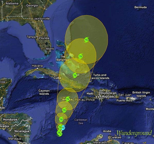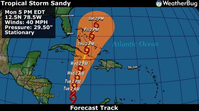 WEATHERBUG reports “Tropical Storm Watches are now in effect for Jamaica and Haiti. This means tropical storm conditions are possible in the next 48 hours. A Hurricane Watch or Tropical Storm Warning may be required for Jamaica later tonight. Tropical Storm Sandy will begin to accelerate north to northeast through the middle of the week. It will approach Jamaica Tuesday night or early Wednesday, producing 5 to 10 inches of rain with isolated higher totals in mountainous locations. This could cause life-threatening flash floods and mud slides. It could even approach hurricane strength as it wallops Jamaica by the middle of the week.