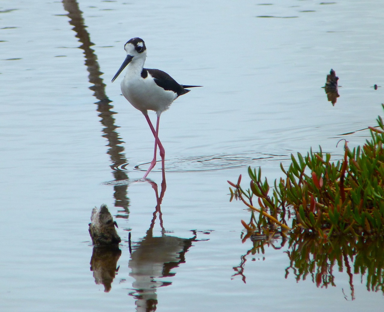 This elegant stilt Himantopus mexicanus was one of a pair nesting in the scrub by a small brackish lake near Crossing Rocks. We had gone there for heron and egret reasons, but for once there were none. Just dozens of BAHAMA (WHITE-CHEEKED) PINTAILS. I had walked to one end of the lake, when suddenly this bird rose from the undergrowth and flew, shrieking, straight at me. It veered off, landing agitatedly in the water, and proceeded to stalk towards me on a zig-zag route, scolding me belligerently.