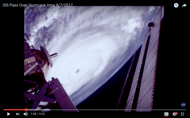 Today’s screenshots were taken during yesterday’s ISS pass over Irma, using external cameras. The one below is the last in the sequence, an upside-down view looking rather like some pale alien spaceship hanging above a dark earth.