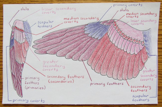 Thanks to the excellent ‘Myr’s Bytes’, say goodbye to ‘what’s the difference between primary & secondary feathers’ misery… This could be the clearest illustration and explanation of a bird’s wing you or I will ever see.