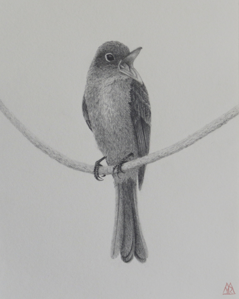 I’m pleased that the bird in my drawing looks sweet-as-can-be and has a beautiful eye, and I like the colours and patterns of the branches and background. However, I’m not jazzed about the streakiness of the feathers. Hoping for more gentle feathery textures and easier control of varying grey shades, I grabbed 2H and HB graphite pencils and a kneaded eraser. I chose a different photo because that open bill is just marvellous! Clearly, Keith and the Cuban Pewees are good friends.