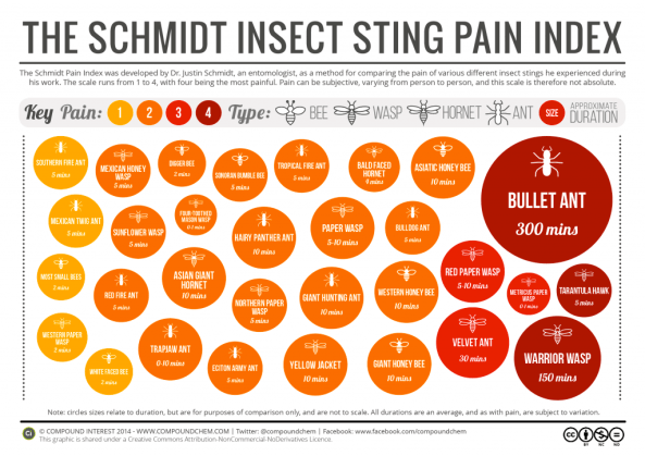 Schmidt produced his SCHMIDT STING PAIN INDEX The pain scale, based on 78 species, runs from 0 to 4, with 4 awarded for the most intense pain. Spider Wasps of the species Pepsis – i.e. Tarantula Hawks – have a sting rating of 4.0, described as “blinding, fierce, shockingly electric. A running hair drier has been dropped into your bubble bath” Only the bite of the Bullet Ant – and the sting of the Warrior Wasp – is ranked higher, with a 4.0+ rating, vividly described as pure, intense, brilliant pain. Like fire-walking over flaming charcoal with a 3-inch rusty nail in your heel”