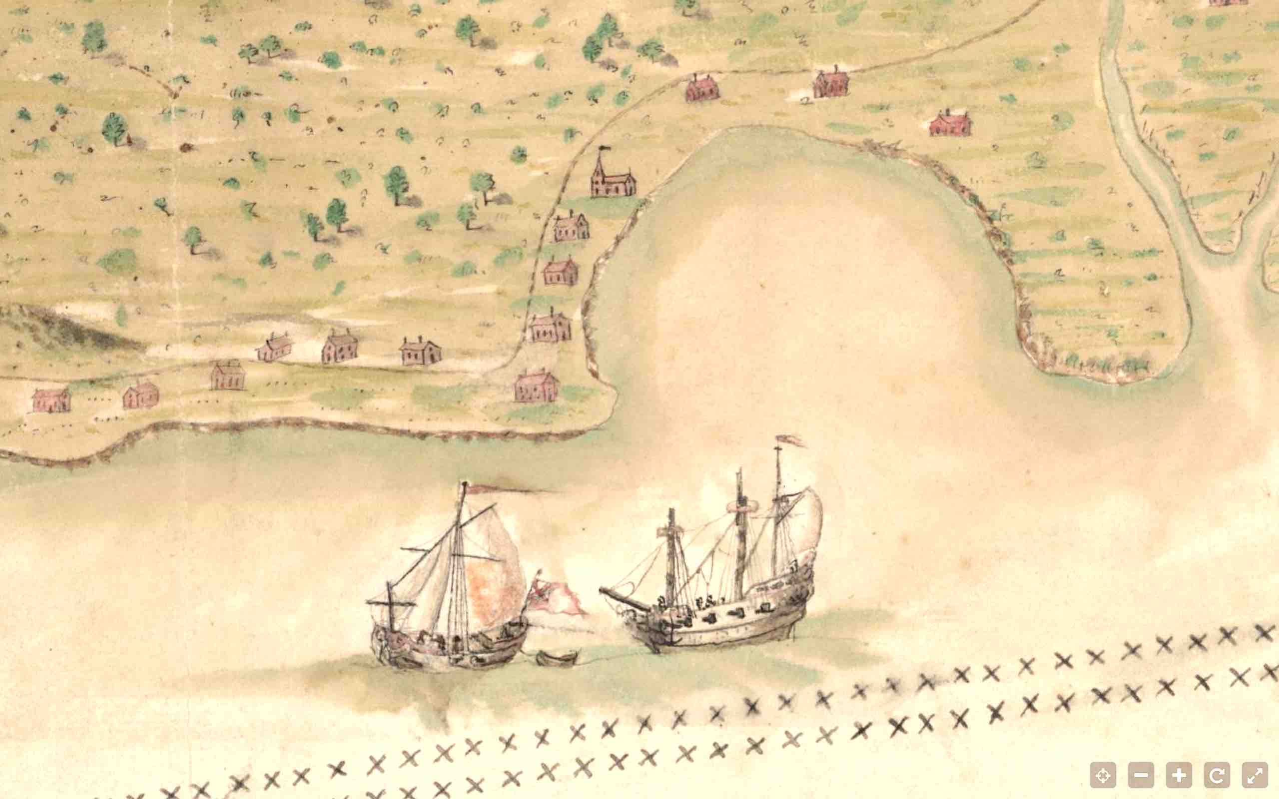 3. BOTTOM RIGHT CORNER (north-west). At last there is more evidence habitation, with a string of dwellings along the coastline. The 2 cays shown have names, West End and ‘Pellican’. And it looks as though the two ships have set out from port. On the left side of the bay above them, a church can be seen. Initially I thought the double row of crosses might indicate an area close to the shoreline that might be safe – or at least safer – from pirate attack. The leading ship – as the detailed crop shows clearly – is a warship. No harm in romantically speculating that it is escorting a trading vessel… More recently an online friend Klausbernd told me that the double crosses on map are in fact a navigational aid indicating cross bearings.