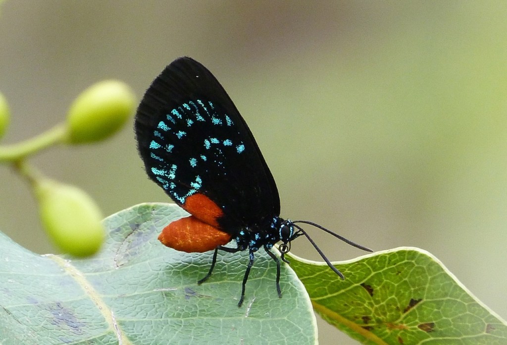 It is rare to see the inside of an Atala’s wings. In flight they tend just to look black; then they land with precision and closed wings (zeugma score!). In sunshine the spots of the feeding Atala shine out like small LEDs. They very rarely open their wing to reveal the velvety blue upper sides.
