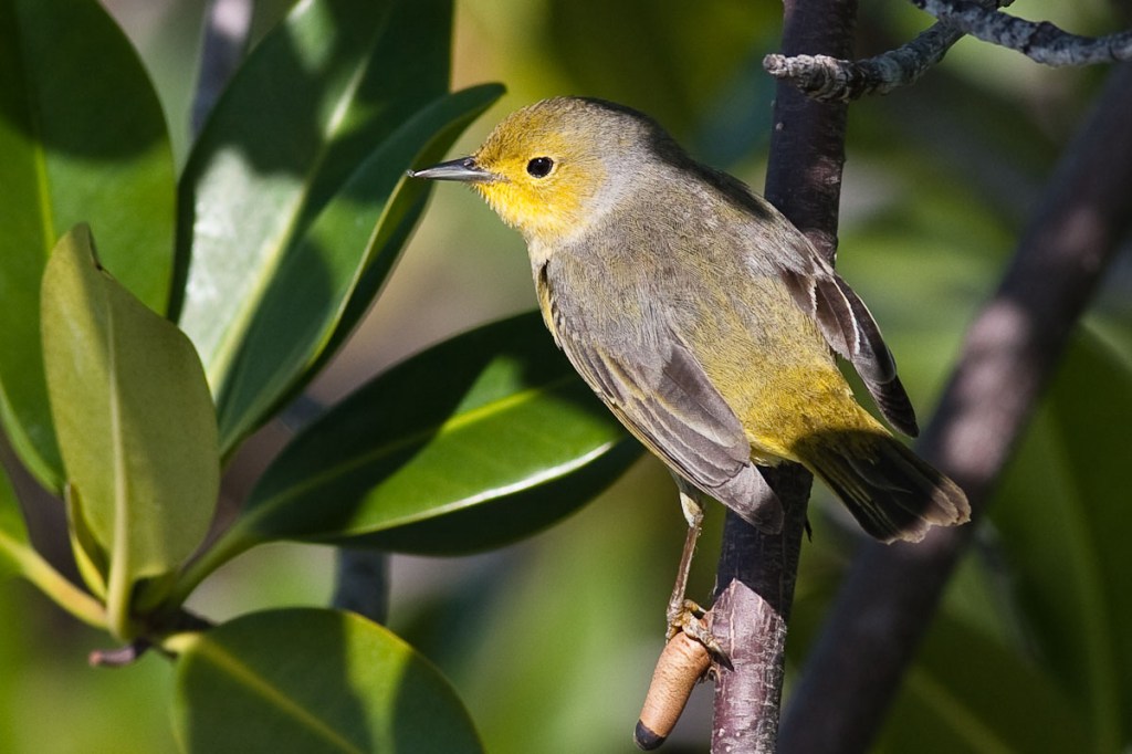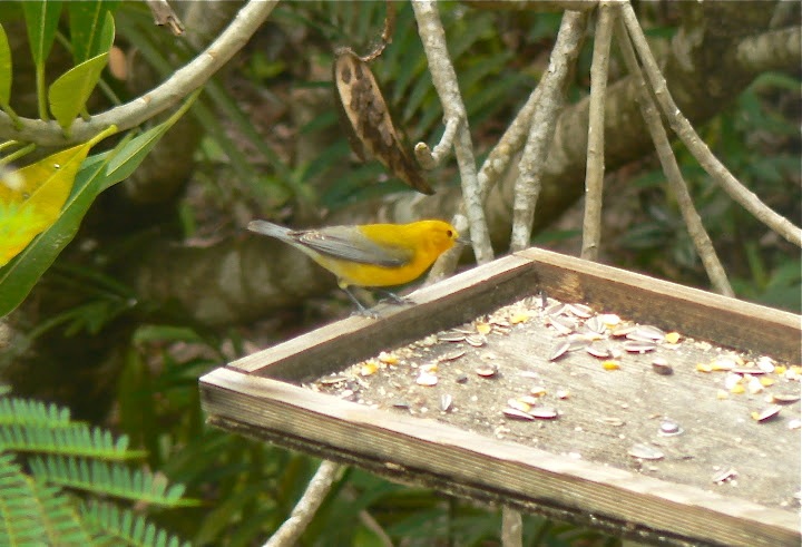 NORTHERN PARULA Small yellow warbler, of which there are many types. This is the one that unwisely tried to fly into the Great Room through the plate glass, and had to be revived by Sandy. It perked up quite quickly, and flew off none the worse for its encounter either with the glass or Sandy…