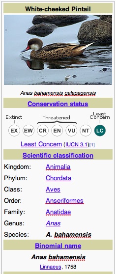 The White cheeked Pintail or Bahama Pintail (Anas bahamensis) is a dabbling duck first listed by Linnaeus in his Systema naturae in 1758, under its current scientific name.