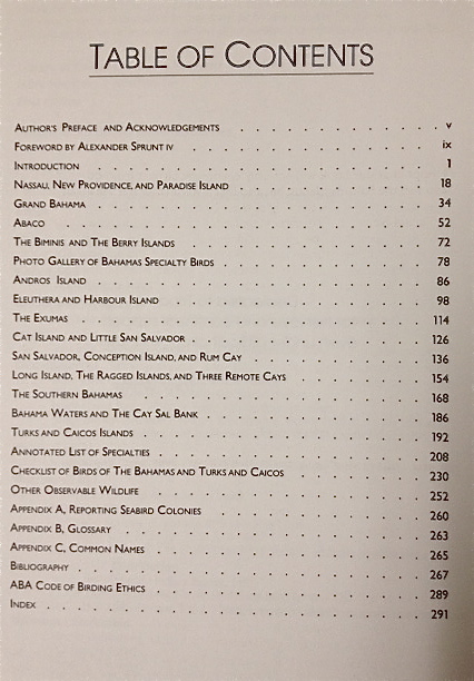 RH VIEW (2012) This book obviously covers a far greater area than Abaco / Northern Bahamas – indeed, it is about as comprehensive of the whole Bahamas region as it could get. Where it scores highly is in taking the area island by island, cay by cay, and identifying the prime birding areas on each. I have to say that, being a 1998 book, some of the descriptions of places on Abaco that I am familiar with are not as you will find them now; and doubtless this applies across the whole region. As the Table of Contents shows, the book is split into ‘places’ chapters, with additional and useful general information chapters. Abaco is covered in just 20 pages. It’s not a lot, but the birding hotspots are well covered, and expected / hoped for bird species are given for each.