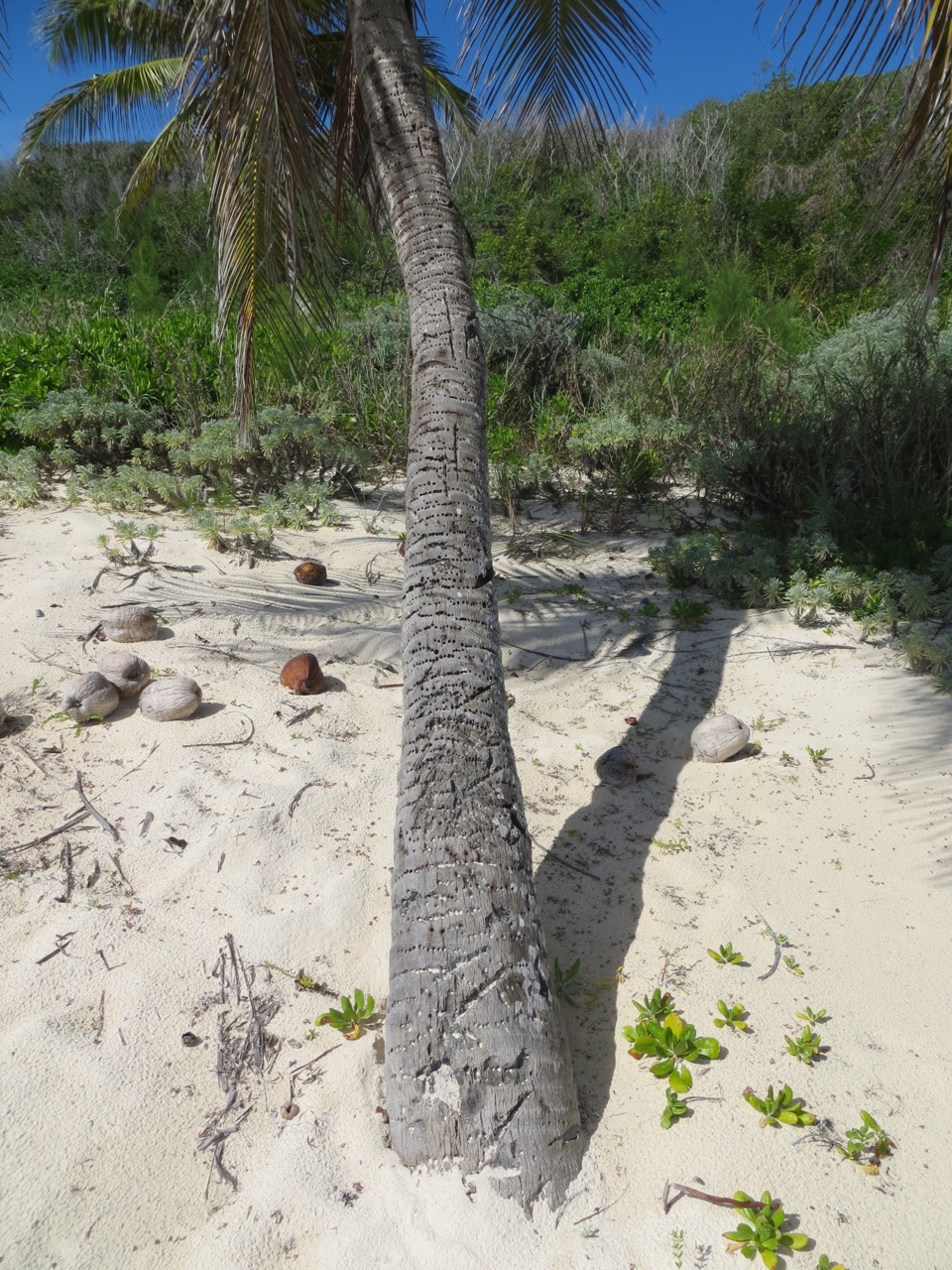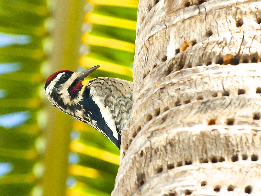 On Abaco, palms are the favourite trees for sapsuckers. There are several palms along the 3/4-mile long curved beach at Delphi. Below is a coconut palm that has seen plenty of sapsucker action, with the drill holes girdling the entire trunk from top to bottom.