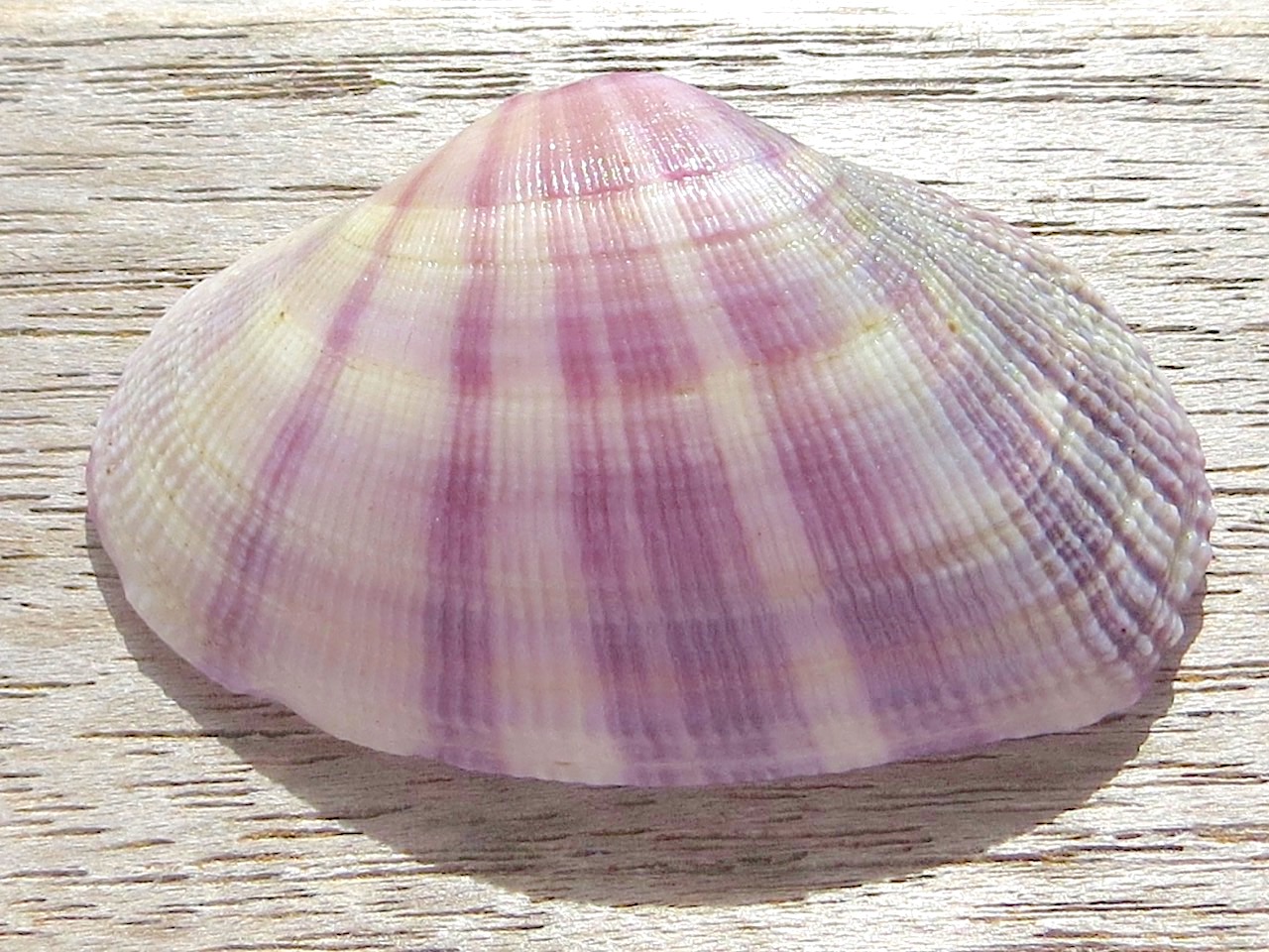 These very pretty shells, with their striking pink radials, are sometimes known as ‘rose-petal shells’. They are always tempting to pick up from the sand. The ‘hinges’ (muscles) are very delicate, however, and with many of these shells that wash up on the beach the two halves have separated naturally.