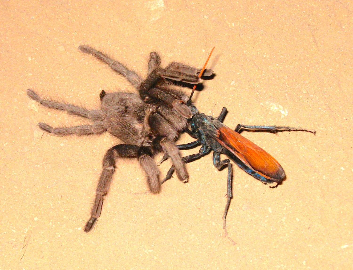 The wasp uses her long stinger to stab her prey. The poison rapidly paralyses the spider. She then drags it to her burrow, lays her egg onto the tarantula’s abdomen, seals the burrow and leaves. Job done
