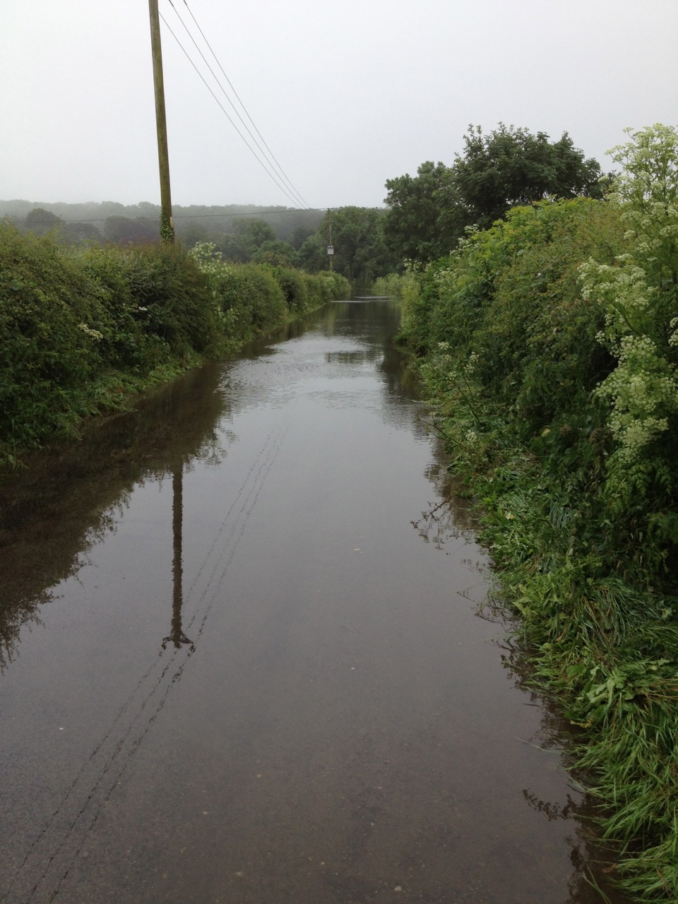 That’s all well and good. But in more northern latitudes the slide from summer via autumn to winter is accelerating. The trout fishing season has just ended, with my final efforts washed away by heavy rain and flooding – this photo is the road leading to one of the beats, a sure meteorological sign that a visit to the local pub would be sensible…