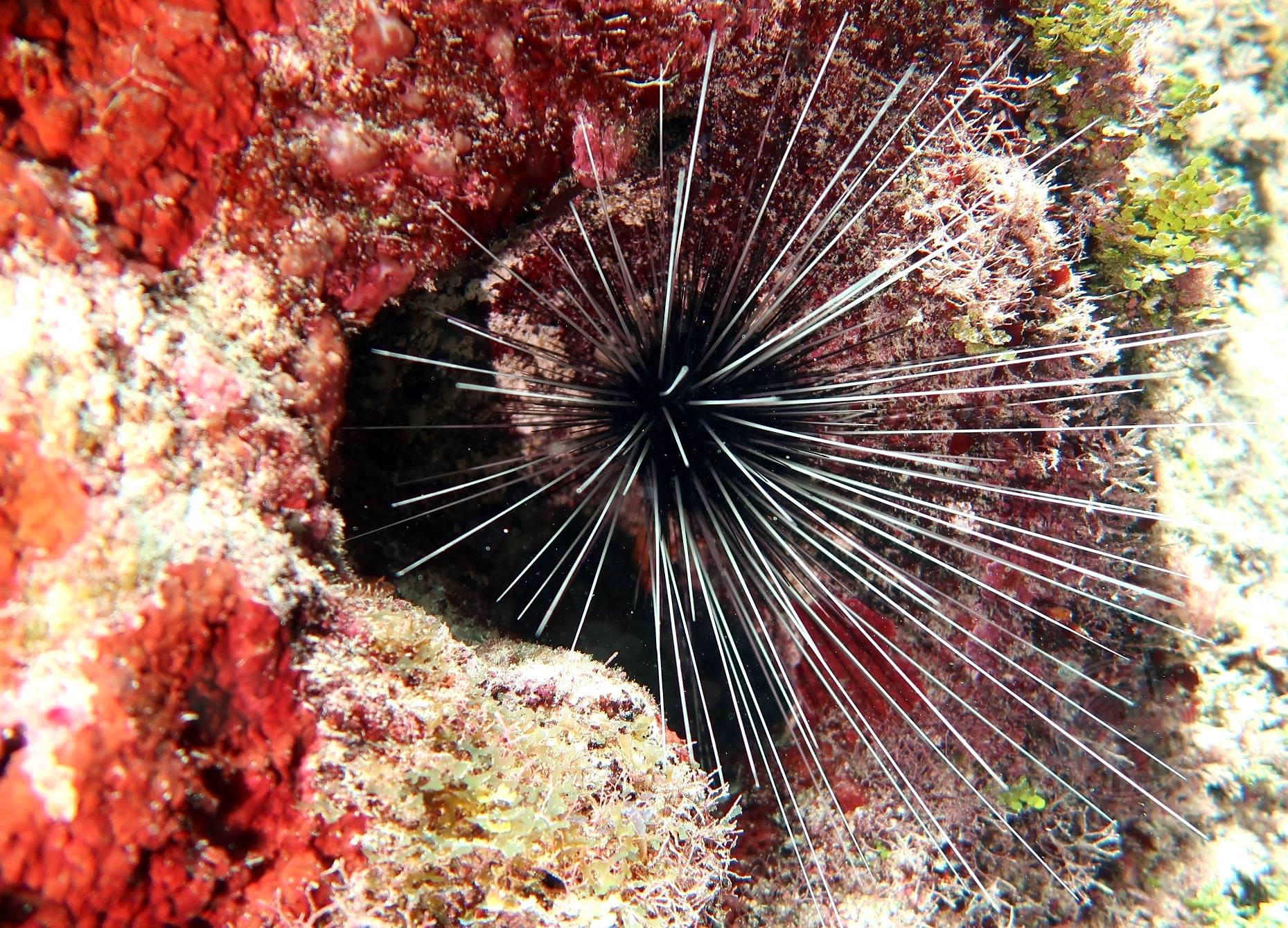 The long-spined sea urchin Diadema antillarum featured in this post is one of those creatures that handily offers its USP in its name, so you know what you are dealing with. Something prickly, for a start. These are creatures of the reef, and many places in the Caribbean and in the western Atlantic generally sustain healthy populations.