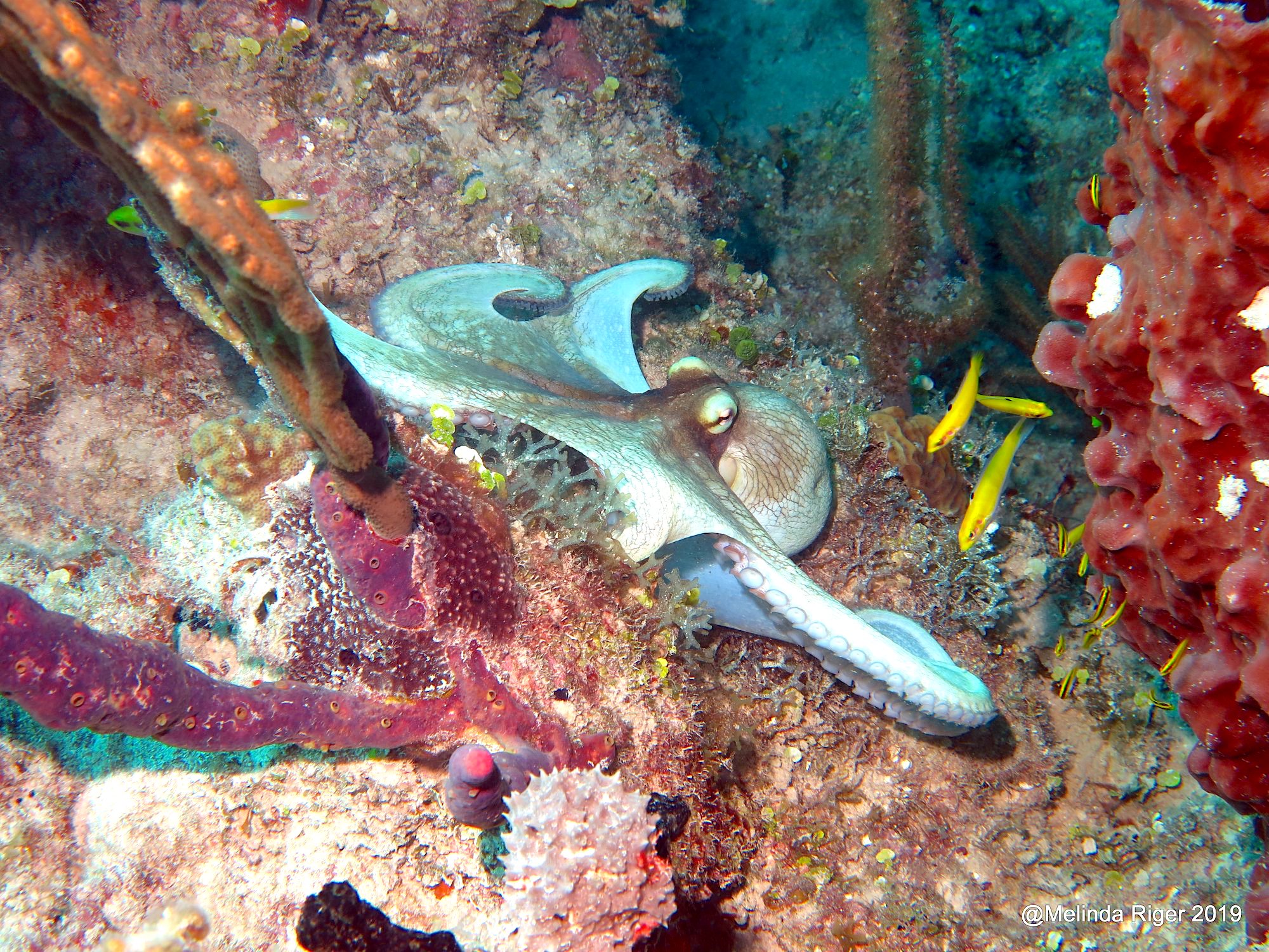 The feature creature here was observed and photographed as it took it a octopodic wander round the reef. The vivid small fishes are out and about. The reef and its static (technically ‘sessile’) life forms – corals, anemones and sponges – look in good order. The octopus takes a pause to assess its surroundings before moving on to another part of the reef.