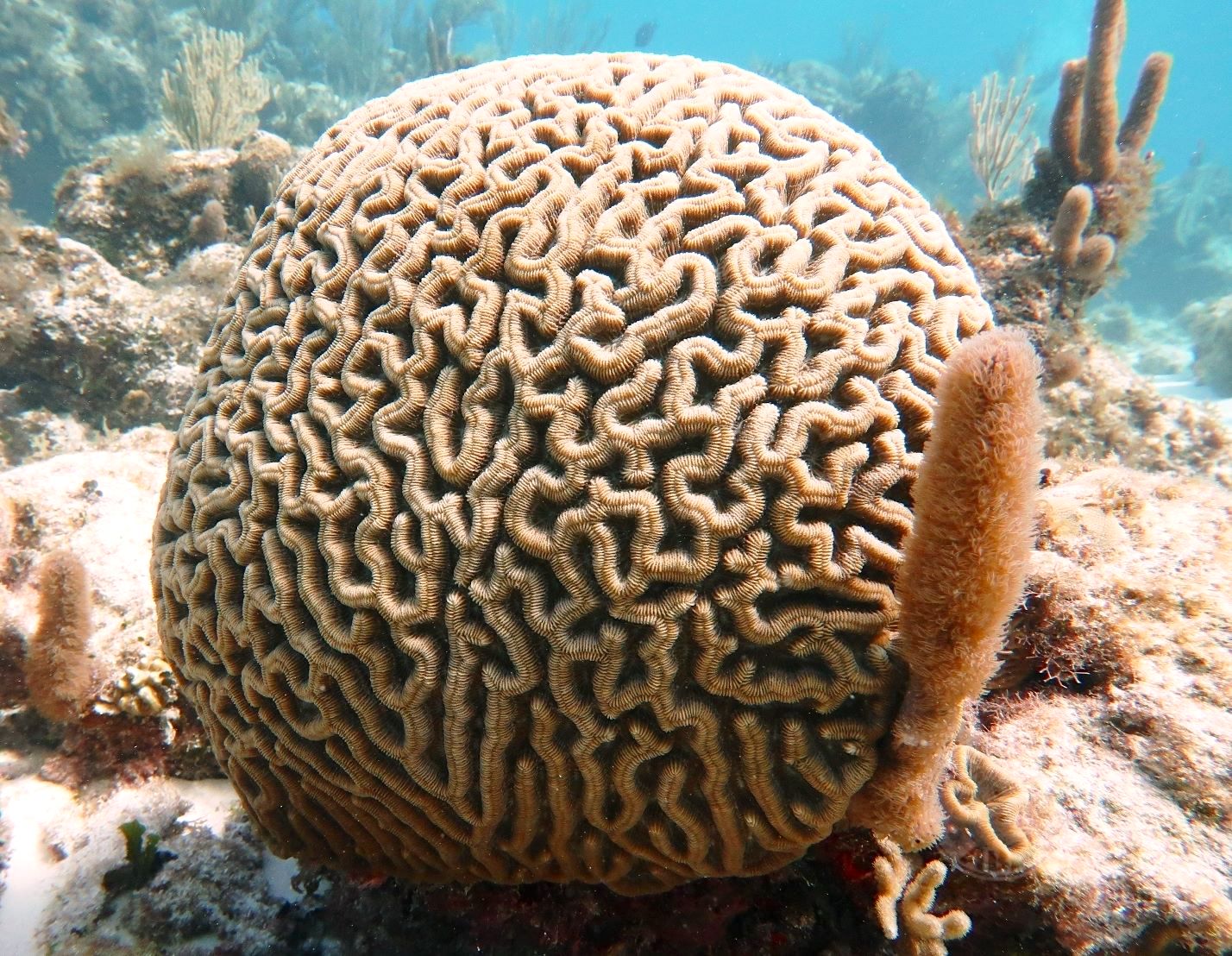 The most apposite description of brain coral Diploria labyrinthiformisis is essentially a no-brainer. How could you not call the creatures on this page anything else**. These corals come in wide varieties of shape and colour, and 4 types are found in Caribbean waters. They date from the Jurassic period.