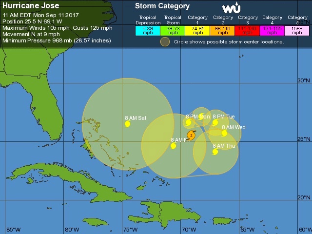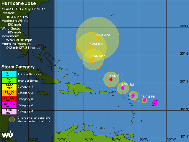 In the tracker realtime shot above, it’s impossible to ignore the lurking menace of Hurricane Jose – recently graded Cat 4 – to the east. Here’s the latest Jose tracker I can find for today. Right now (but who knows for how long) this system looks as though it may hook north and expend its savage energy in the open ocean.