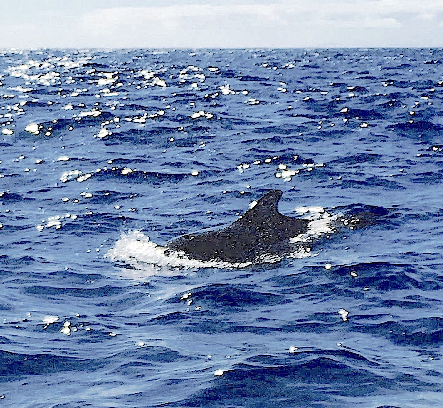 One of the dolphins turned out to be a young 3rd generation animal from the same family, recently weaned. The BMMRO has a large photographic library of dolphins and whales, collected over many years. In the photo above, you’ll see that the dorsal fin of the nearest one is ragged, especially near the top. This is the primary method by which individual animals are recorded to assist with subsequent identification in the field (= water) or back at base in Sandy Point by means of the photo archive.