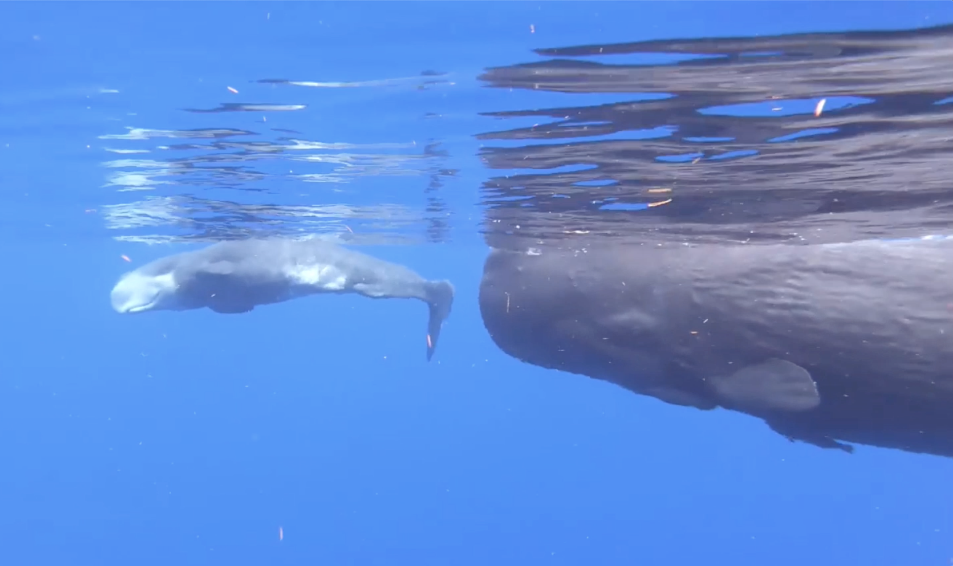 Adult sperm whale with neonate calf [BMMRO Bahamas]