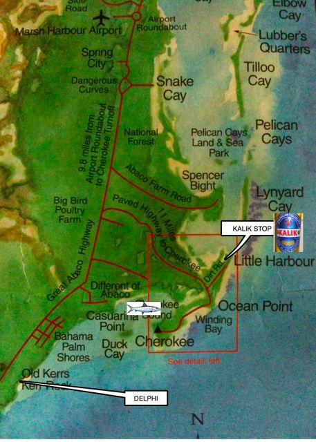 ROUTE: Turn right at the end of the drive, head north past Bahama Palm Shores until you get to the right-hand turn to Cherokee / Little Harbour / Winding Bay. Take the made-up road to the end, following the right-hand bend that will bring you to Cherokee. You will pass the Abaco Club, Winding Bay, a Ritz-Carlton enterprise. It doesn’t need any meagre publicity from this quarter – just ask Sandy what you have to do to play golf there, eat there, use the spa, buy a cabana and so forth.