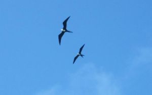 Bird Alert 2 At Rocky Point you are quite likely to see black Magnificent Frigate birds (man o’ war birds ) overhead. Or you may see the graceful white-tailed tropic bird. If you are very lucky, as we once were, you’ll get both mingling together above the bay.