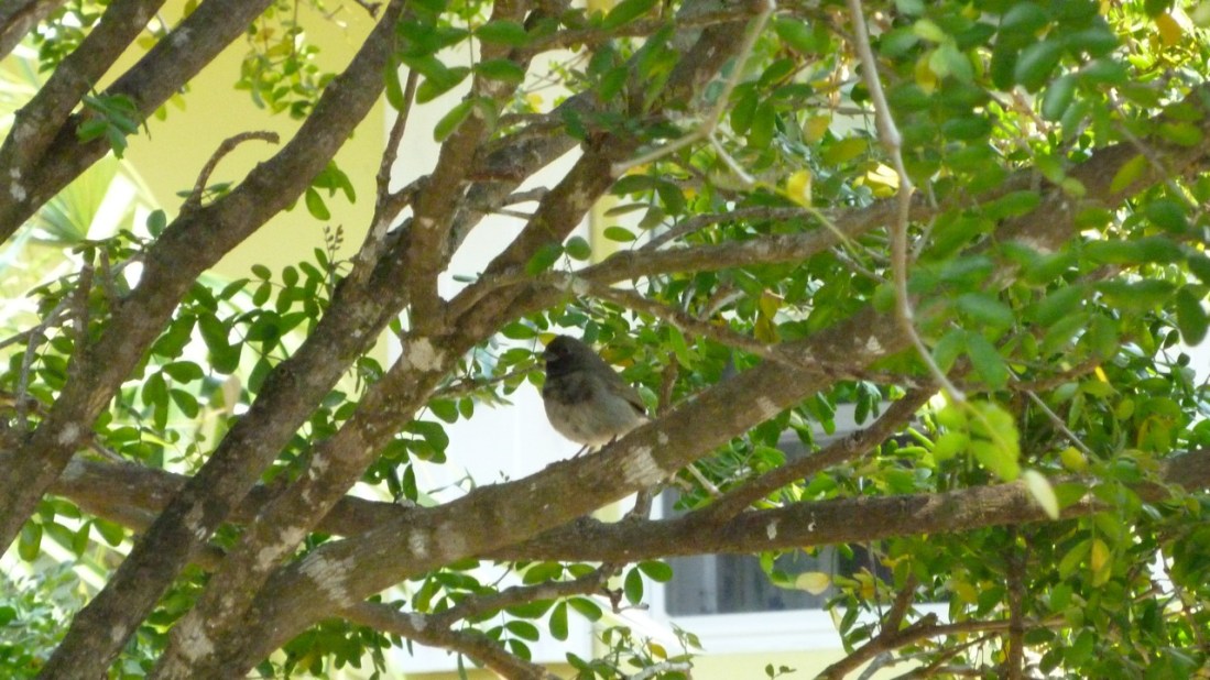 A Lignum Vitae tree at Bahama Palm Shores, Abaco, with a camera-shy juvenile black-faced grassquit