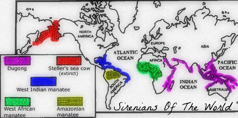 This map shows the world distribution of the 4 extant sirenian branches as well as the extinct STELLER’S SEA COW of the north Pacific. It is a melancholy fact that by 1768, a mere 27 years after its discovery by Europeans, this slow-moving, tame and easily-captured sea cow was hunted to extinction. 250 years on, the world’s sirenian population remains vulnerable and, as with whales and dolphins, in need of active monitoring and protection measures