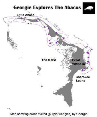 The BMMRO has just published the Fall 2012 newsletter, and it’s no surprise to find that the front page news is the arrival of young manatee Georgie on Abaco. After nosing and indeed grazing her way around Abaco and the Cays, she still appears to be contentedly moored in Cherokee after the best part of a month. Here’s the official map of her wanderings