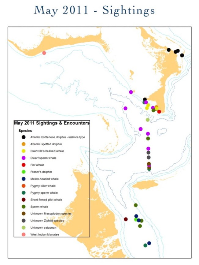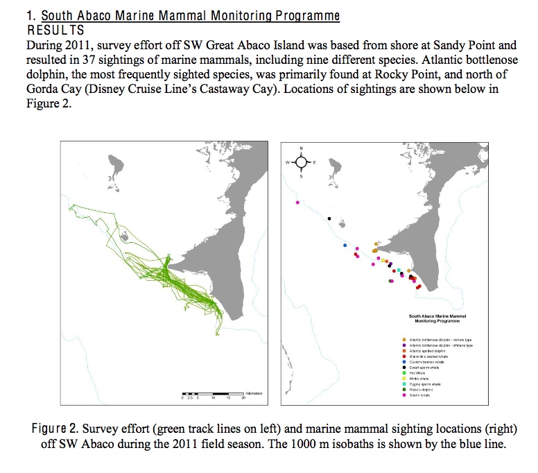 2. Here are results specifically relating to South Abaco, where the majority of cetacean activity is observed (see ‘green’ map). I have included a larger image of the cetacean species so that the key is easier to read