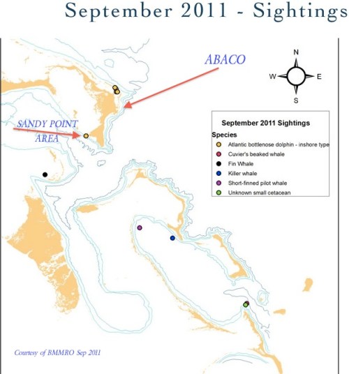 After the prolific sightings in July, especially around the Grand Bahama Canyon on Abaco’s southwest coast, it’s a surprise to post last month’s sightings taken from the BMMRO site. There has been Hurricane Irene to contend with, of course, but I have now had an email from Charlotte Dunn with a bulletin from Sandy Point: good post-Irene news and the explanation for the chart below: