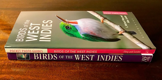 There’s one small book that is, at first glance, far too wide in scope and slim to be of much use in the Northern Bahamas. However, it contains many of the birds that a casual birder might come across on Abaco. It’s not comprehensive by any means, but it’s useful and handy. First published in 2000 with subsequent reprints, Birds of the West Indies by Flieg and Sander was repackaged as a new edition last year. I meant to write about it sooner; now I have got round to it. Here is a photo of the original – already a small pocket-sized book – and on top, the new revised edition: slimmer, lighter and apparently more up-to-date.