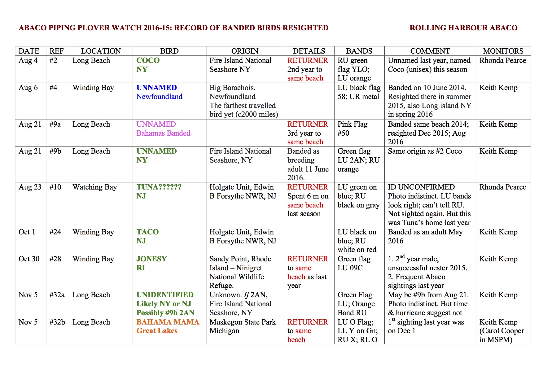 • 2017 Again resighted  in October on Long Beach Abaco and overwintered