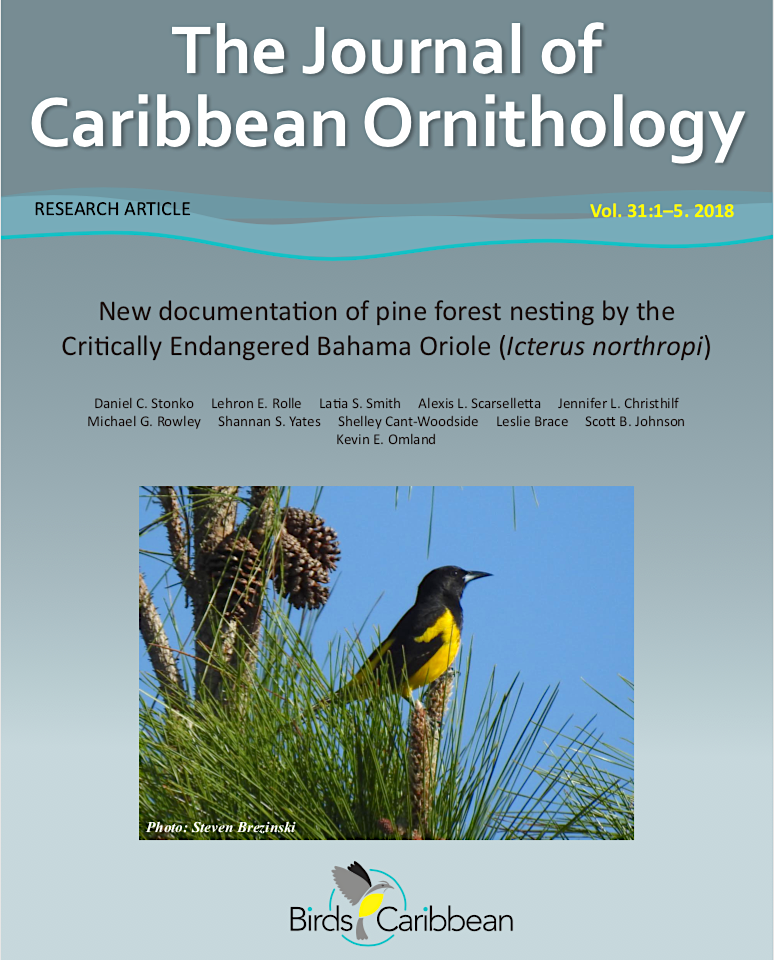 The Bahama Oriole (Icterus northropi) is a Critically Endangered species endemic to The Bahamas and currently found only on the Andros island complex. With the elevation of the Bahama Oriole to full species status in 2011, research suggested that there were fewer than 300 individuals remaining in the global population. The Bahama Oriole was also termed a “synanthropic species” based on data suggesting that the species nested almost exclusively within anthropogenic residential and agricultural habitats in introduced coconut palms (Cocos nucifera). These conclusions were based on population surveys primarily confined to settled areas near the coasts. However, we documented multiple pairs of orioles with breeding territories deep in pine forests, and we present the first records of Bahama Orioles nesting in pine forests—in both a Caribbean pine (Pinus caribaea) and native understory Key thatch palms (Leucothrinax morrisii). Given the predominance of the pine forests on Andros, this newly documented breeding habitat has important implications for developing population estimates and future conservation plans for the Bahama Oriole.