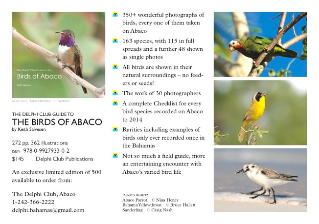 ‘THE BIRDS OF ABACO’, of which I am the author, was published in 2014. The book was designed by Sally and published by Peter Mantle / The Delphi club. By the end of last year the edition had sold out, and all planned educational donations to schools, libraries and relevant organisations had been completed.