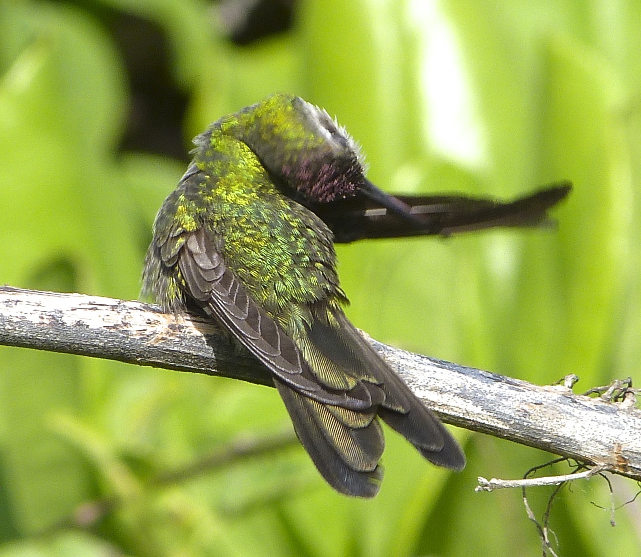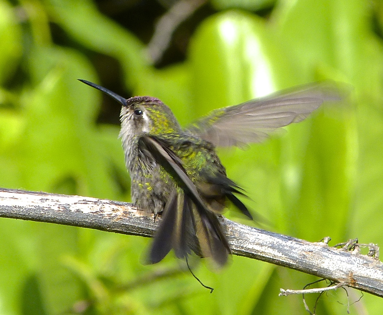 There’s probably a great deal to be written about the emeralds, but not by me. Or not now, anyway. The little you need to know from me is already covered above, and I haven’t yet discovered whether their childcare arrangements differ significantly from the woodstars. Probably not. So I’ll put in a selection of photos, and remark that it is strange how quickly they can change from sleek and slender birds to small rather cold and dispirited looking bundles of feathers. Both states are depicted below. Here’s what to listen for (credit Xeno-canto.org)
