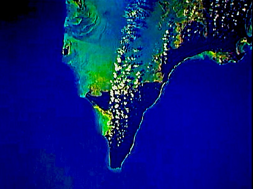 This image appears to be a blow-up of the sharper ‘filmic’ second one above. The detail has become hazy and indistinct, though part of the island-long ribbon of highway remains clearly visible. Time for a photo-enhancing experiment…