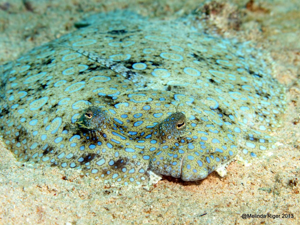 Yes they do indeed. If you have been admiring the fish shown so far, you’ll have noticed that the colour of each one differs from the others. In addition to the predator-protection that the eyes provide, the peacock flounder can make itself (near) invisible. They can rapidly change colour to match their surroundings. There are 3 reasons for this: to avoid / confuse predators; to conceal themselves on the sea-floor to catch passing prey; and, as dive expert Fred Riger has pointed out, “the male peacock flounder can, and does greatly intensify his colours to declare territory and attract females. When doing this the males will also signal with the left pectoral fin, sticking it straight up and waving it around.”