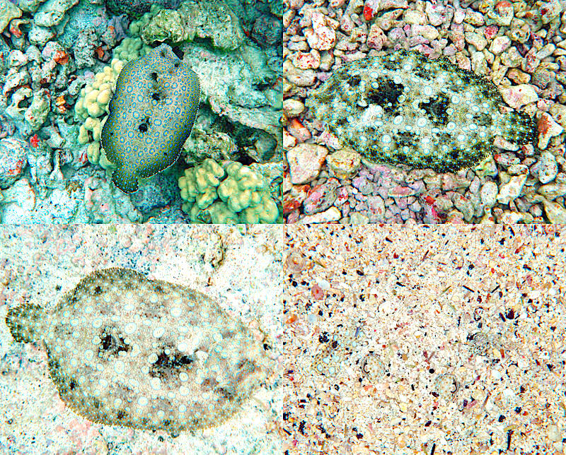 Matching the background happens as the fish swims, and in a few seconds. When they rest on the sea-floor, the camouflage may even become total. In #4 above you can just about make out the eyes. The whole effect is known as ‘cryptic coloration’ or CRYPSIS. In contrast, the image below shows just how adaptable the transformation can be. Note how the fish can even mimic the pinkish tinge of the sand perfectly. If threatened, the fish will bury itself in the sand, with just its eyes showing.