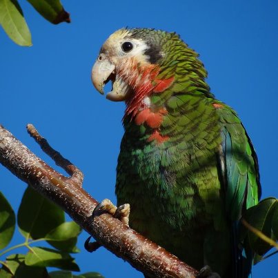 “The Cuban Amazon (Amazona leucocephala) also known as Cuban Parrot or the Rose-throated Parrot, is a medium-sized mainly green parrot found in woodlands and dry forests of Cuba, the Bahamas and Cayman Islands in the Caribbean. The Cuban Amazon lives in different habitats on different islands. It was once found throughout Cuba, but it is now mainly confined to the forested areas of the main island and Isla de la Juventud. On the Cayman Islands the parrot lives in dry forest and on agricultural land. Cuban Amazons nest in tree cavities throughout most of its range, the only exception being that the parrots living on the Abaco Islands nest underground in limestone solution holes, where they are protected from pineyard wildfires.”