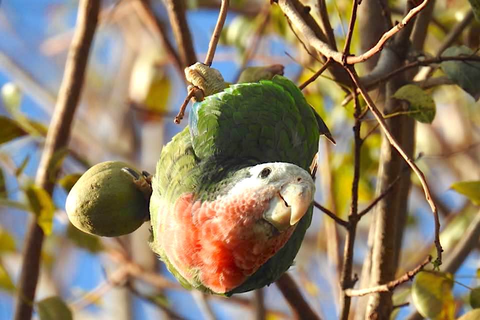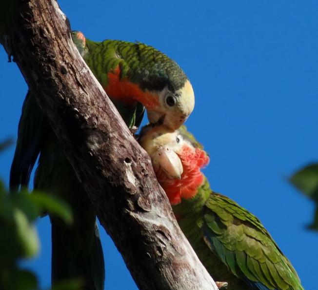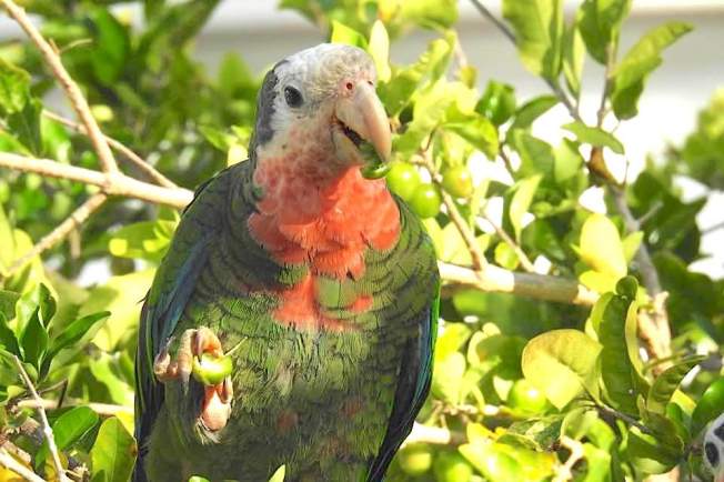 Here are some Abaco parrots doing what they love to do in between group squawking sessions: gorge themselves on fruit, and getting at it any which way.