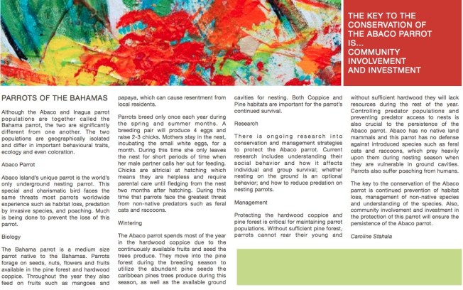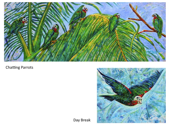 A recent reception was held in Nassau to showcase this series of paintings. You will find more about them by clicking the link to open a pdf of the reception brochureABACO PARROT PAINTINGSCaroline Stahala contributed an excellent one-page article about the Abaco Parrots and their conservation – click on it to enlarge to legible size
