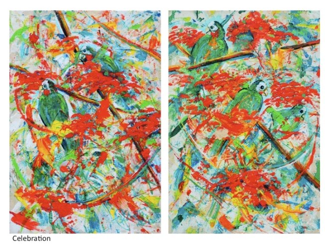 There are places on Abaco – south Abaco in particular – where the parrots congregate in noisy groups during the day. Many people manage to take photographs of them. Good photographers with a decent lens can get outstanding results. Even the camera-incompetent (I hear my name!) can manage the occasional first-class photo, given time and plenty of spare space on the camera card… But very few can do justice to these colourful birds in paint.