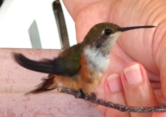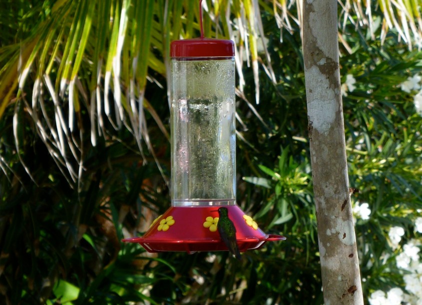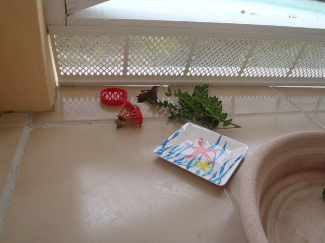 Mmmmm. 3 failed attempts. Not encouraging. And Carolyn needed to leave Exuma imminently. Luckily, a new life for Baby was at hand with a family in Georgetown who were able to supply a happy ending, having cared for hummingbirds and being perfectly set up with a screened porch with shrubs, flowers, feeders… and fruit flies. Hummer heaven. I am waiting to hear the very end of the story… did Baby ever fly, or is she so pampered in her new home that there is no need for her to budge? And when I get some news, I will post it here.