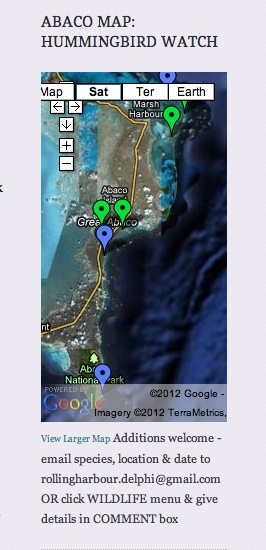 This blog usually stays pretty close to base on Abaco, with occasional forays to other parts of the Bahamas. Inagua for example, for amazing photos of the annual FLAMINGO banding. Now it’s time for a visit to Exuma. In July, a resident of Stocking Island emailed me asking for advice about a rescued hummingbird that had arrived on her porch and could not – or would not – fly. Caroyln had nursed her – a female Bahama Woodstar – for 5 days and was worried about her (lack of) progress.