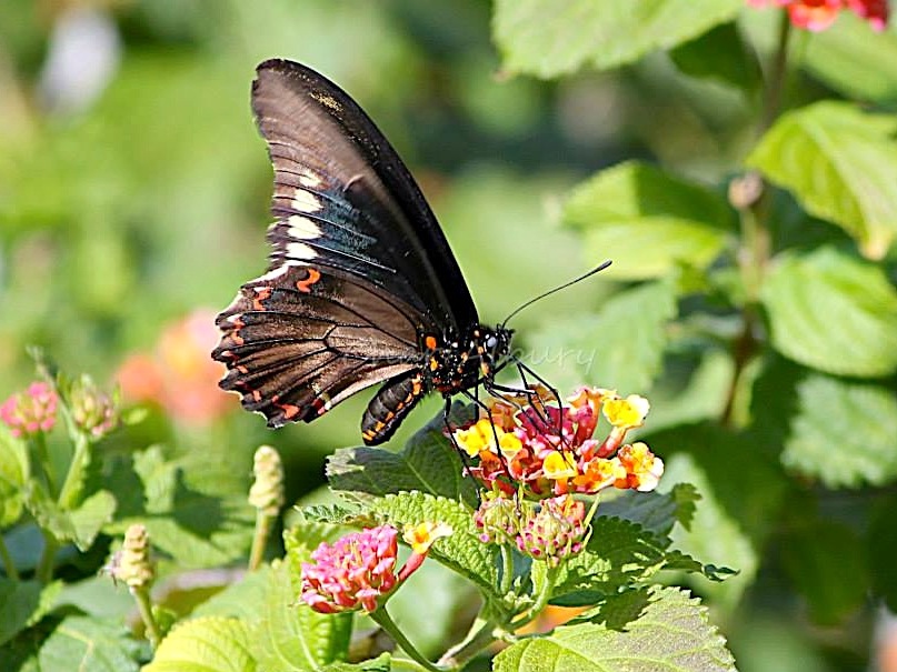 The Polydamus ‘Gold-rimmed’ Swallowtail Battus polydamas is a familiar sight in the Bahamas. It’s known by all the names above, though not all at once to be fair. This is the medium-sized black-brown butterfly with gold accessories and a tasteful selection of red ornamental jewellery. It’s one that hardly stays still for a moment. Its perpetual motion tendencies make it a right little… well, they are hard to photograph. I’ve never taken a totally still photo with no blurring from the creature’s rapid wingbeats.