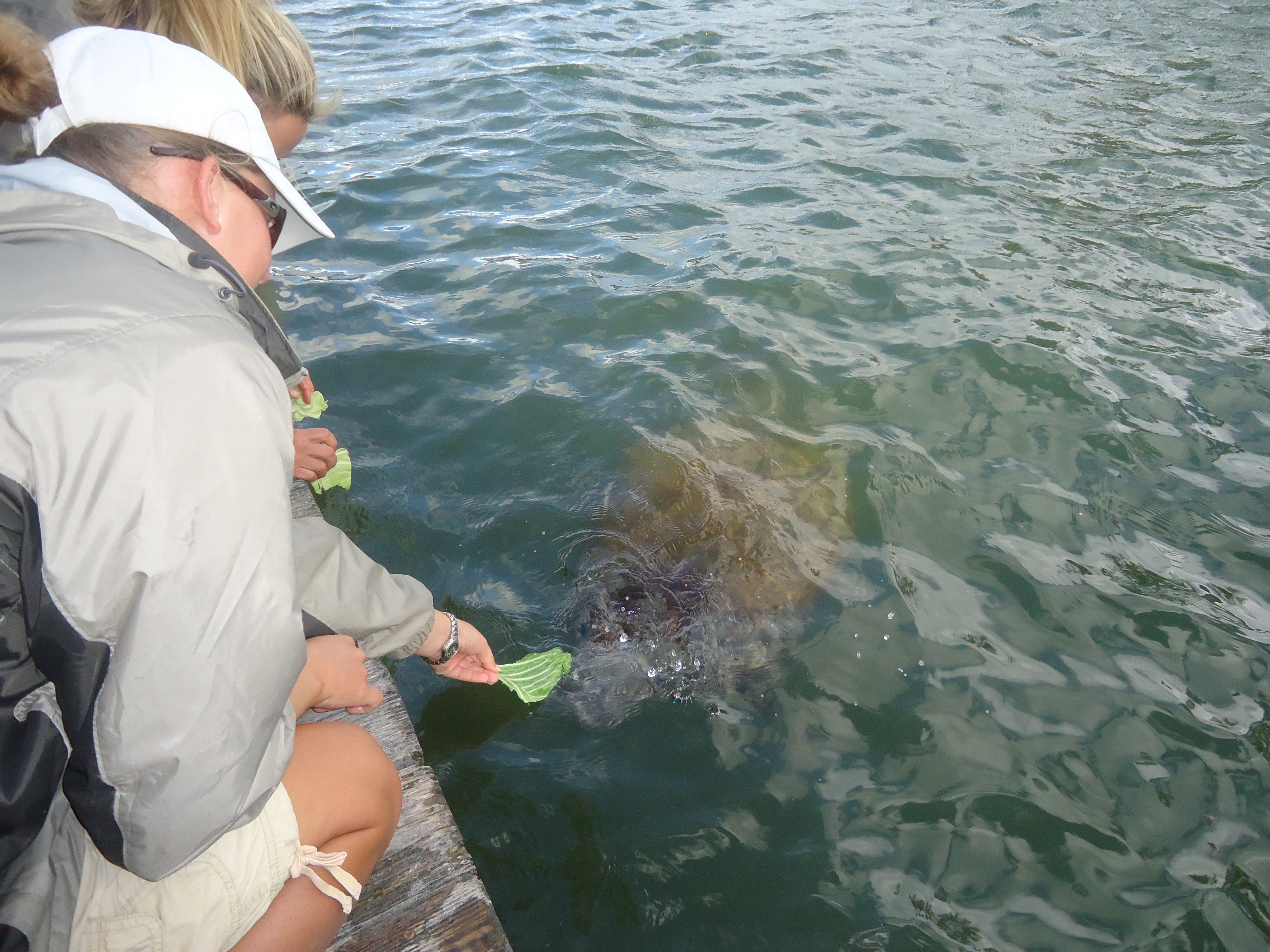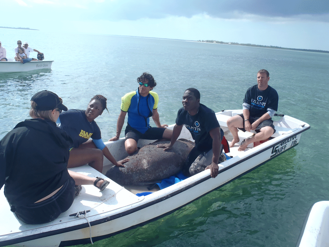 Around a month in I was lucky enough to be sent by Di and Charlotte to Great Harbour Cay on the nearby Berry Islands to work with the manatees there, in particular Georgie; a recently released juvenile whose status is being carefully monitored after her rehabilitation at Atlantis’ Dolphin Cay following health problems. The work here for a week under the guidance of Kendria; a Bahamian contracted by BMMRO to monitor the manatees on the Berry Islands, consisted of tracking Georgie using a satellite tag attached to a belt around her tail. Once located, we logged her position and made any notes on her health and behaviour aswell as the other manatees that were often found with her (there are currently 6 located on Great Harbour Cay). Two days in her tag was found unattached at a locals dock (it has a weak-link incase of entanglement) and we had to locate her using underwater hydrophones to detect her belt. Once found, I had the rare opportunity of entering the water with her in order to re-attach a new tag to her belt; it was amazing and one of the best encounters I have had with any animal! It is impossible not to love these amiable and gentle creatures, especially when you observe their infamous ‘hugs’ in person!