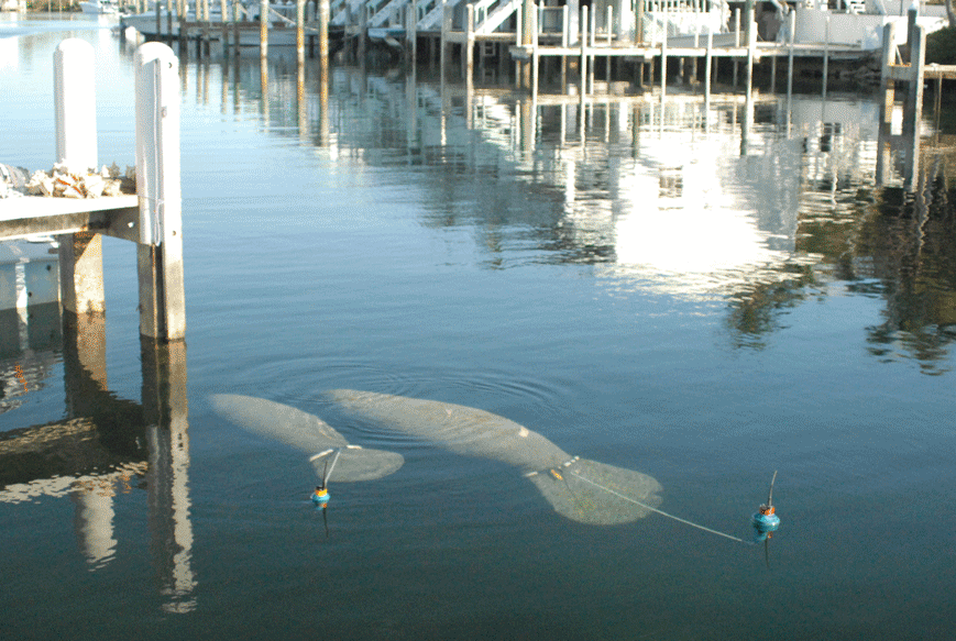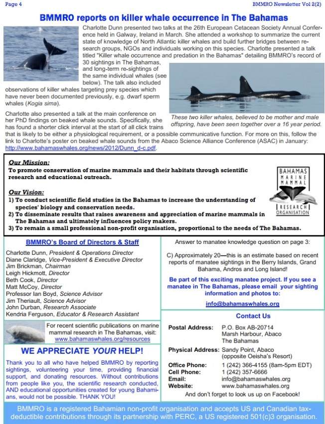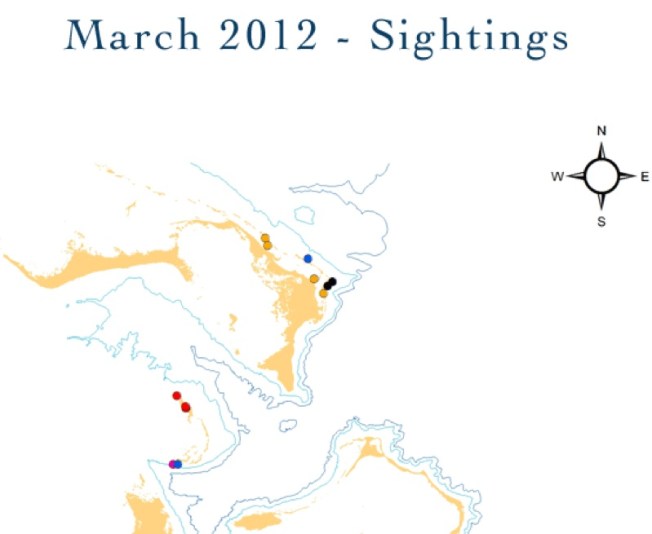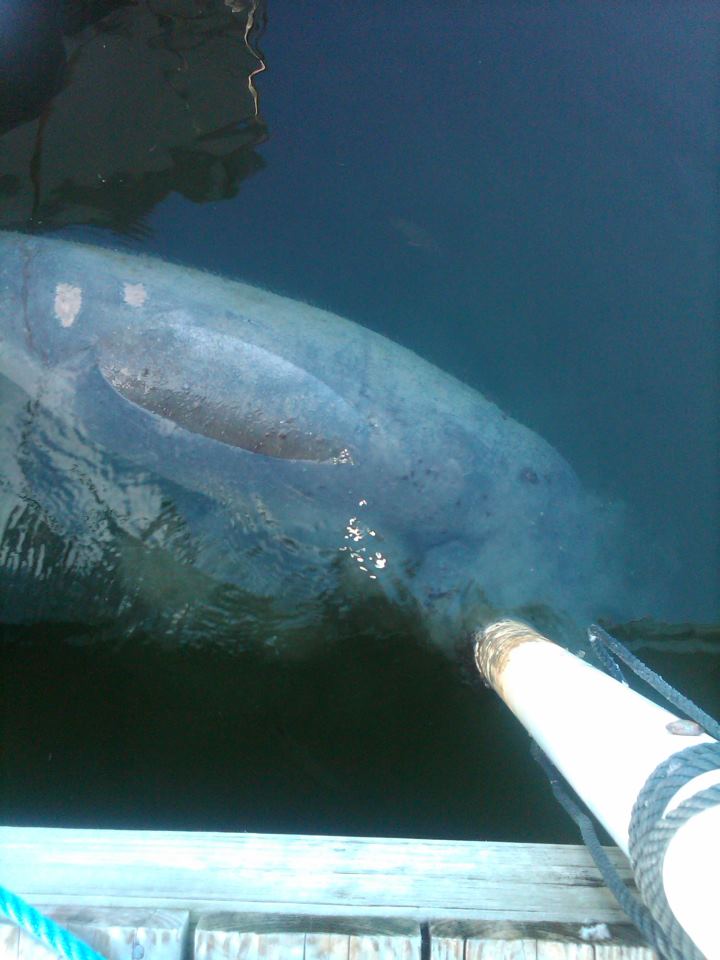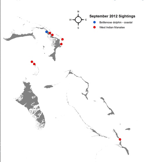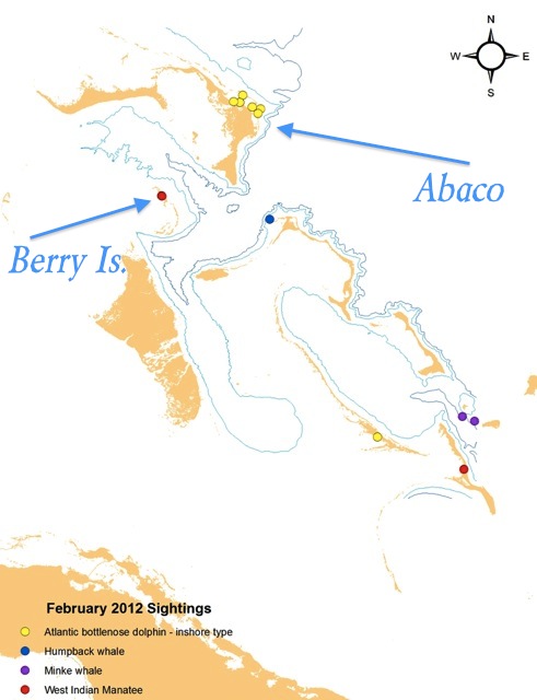 The last quarter of 2012 produced relatively few open-ocean CETACEAN sightings, not least because of a reduction in spotting trips during the period, with some members of the team elsewhere in the world completing their research. SIRENIAN activity is thankfully on the increase, with reporting opportunities increased by the manatees’ preference for sticking close inshore, usually in harbour areas. Georgie has gained her first yellow spot as Abaco’s only resident manatee following her long trip over from the Berry Is. (and away from mother Rita) last summer. She has taken up residence in Cherokee. She performed a worrying vanishing trick during Hurricane Sandy, holing up (presumably) in seagrass off-shore, and (definitely) in an inshore channel for some of the time. She went AWOL again before Christmas, but has returned to Cherokee in good condition after a short vacation. Having shed her tag (several times) it was not possible to track her. The big plus is that she has proved capable of independent living, and has not become reliant on proximity to humans and their offerings of cabbage leaves etc… This photo was taken at Cherokee a few days ago.