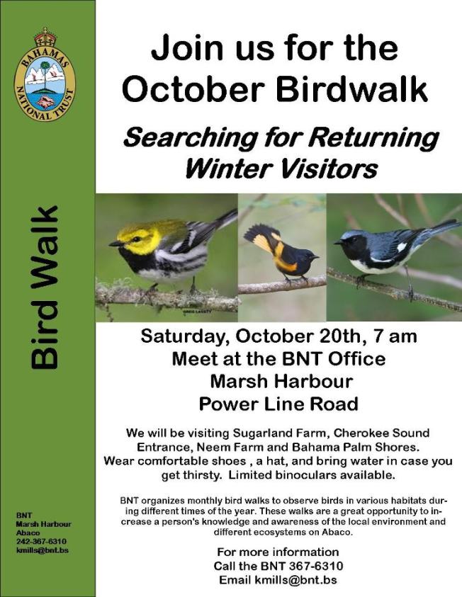 This sounds a lot of fun, and I wish I could be taking part. I’ve never been on Abaco in the autumn when the winter migrants start to arrive as the weather cools in their summer breeding grounds. It must be exciting to see the various species gradually reappear after their summer break, presumably with all the young birds born this year that will see Abaco (and the feeders!) for the first time. If any blog-follower goes on the expedition and happens to keeps a birding record, I would love to know which species you have seen . And if anyone gets some good pics, likewise…