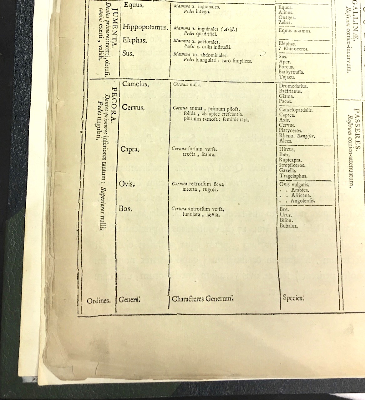 At the bottom of the first column, horses, hippos, elephants and varieties of pig are classified together; followed by varieties of camel, deer, goat, sheep and cattle.
