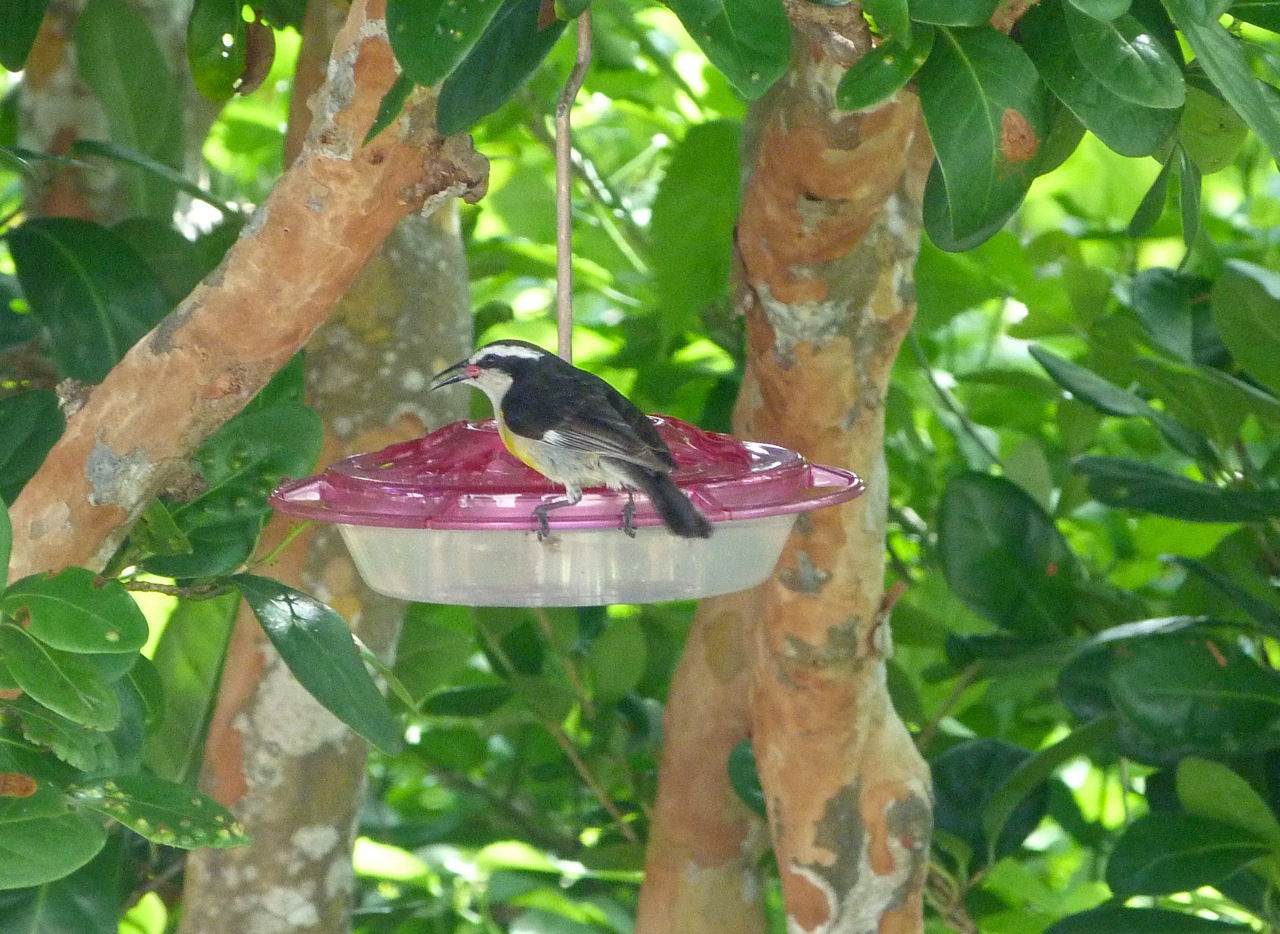 This handsome adult was a regular at one of the feeders at Delphi. The base of its beak is red as opposed to orange (I don’t know the technical term for this bird part. Is ‘mouth’ too simple? Someone tell me, by all means, via the comment box). Bananaquits enjoy the hummingbird feeders, which their narrow curved beaks seem to manage. There, they are not pestered by the (very greedy) black-faced grassquits and the larger Greater Antillean Bullfinches who enjoy the other types of feeder available and take priority in the pecking order.