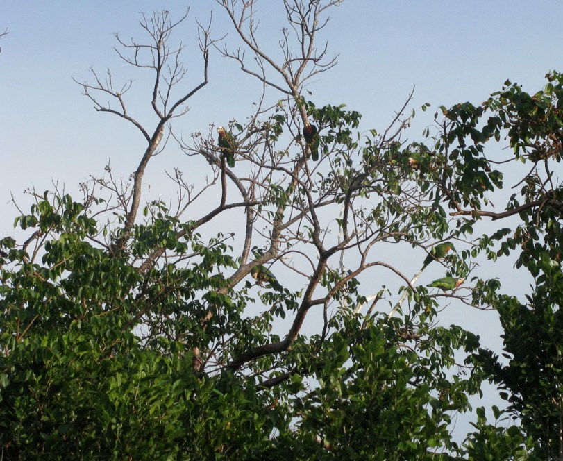 “As far as current parrot news.  Well, they are all around the lodge at the moment.  I can hear the parrots each day right on cue at 7:30 in the morning and then again just after 4pm.  They have been foraging in the fruiting hardwoods in the area, especially the Gumbo Limbo (Bursera simaruba).  I am attaching a picture of a small flock I saw right on the drive in front of the house. A couple of pictures are close up of the parrots and the ones with the Delphi signs do have parrots in them, see if you can find them. They have even been spotted just behind the pool.  Let’s hope they decide to make this a habit. I am currently working on getting the summer field season organized… writing reports and grant applications is the necessary evil in order to have a summer field season”